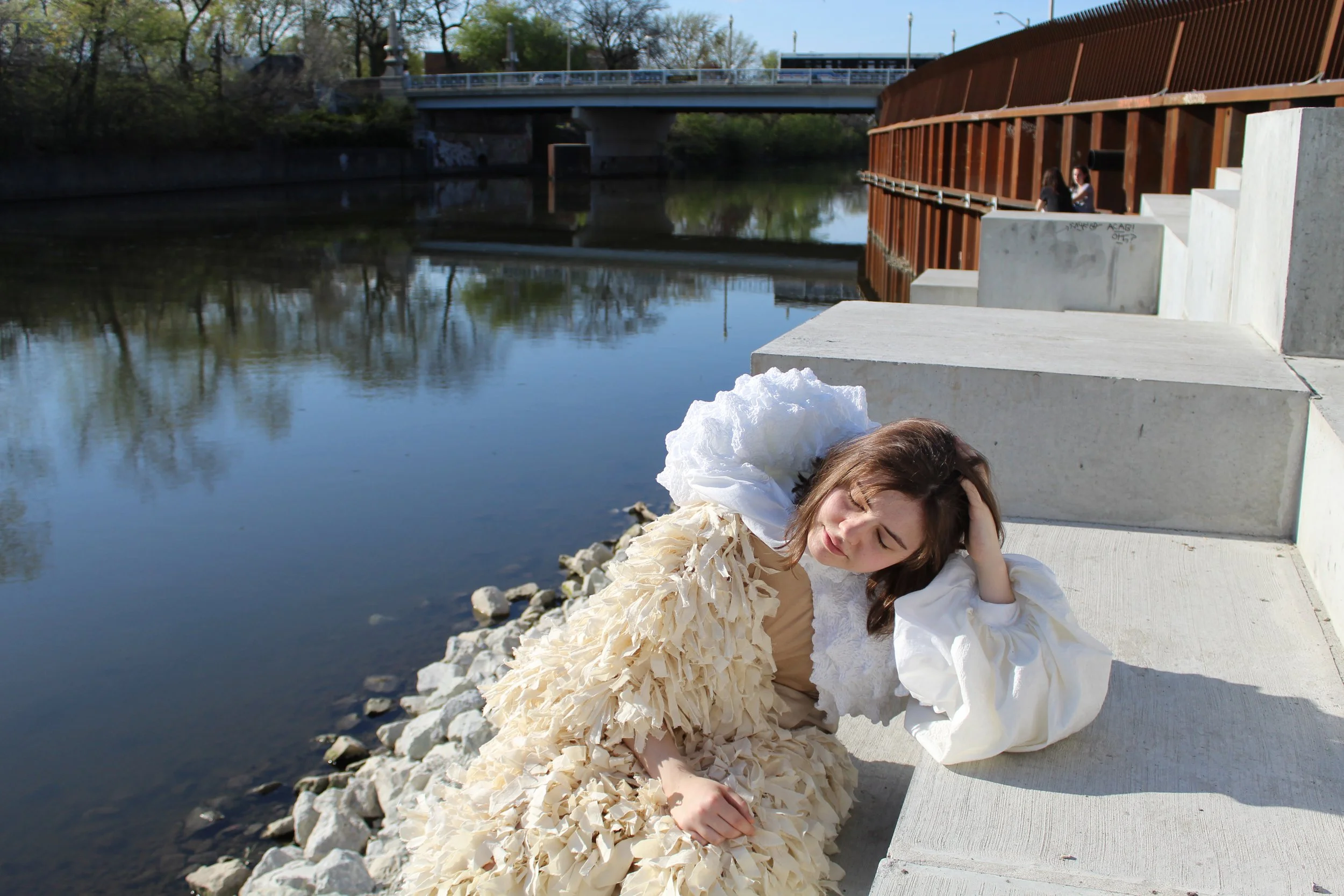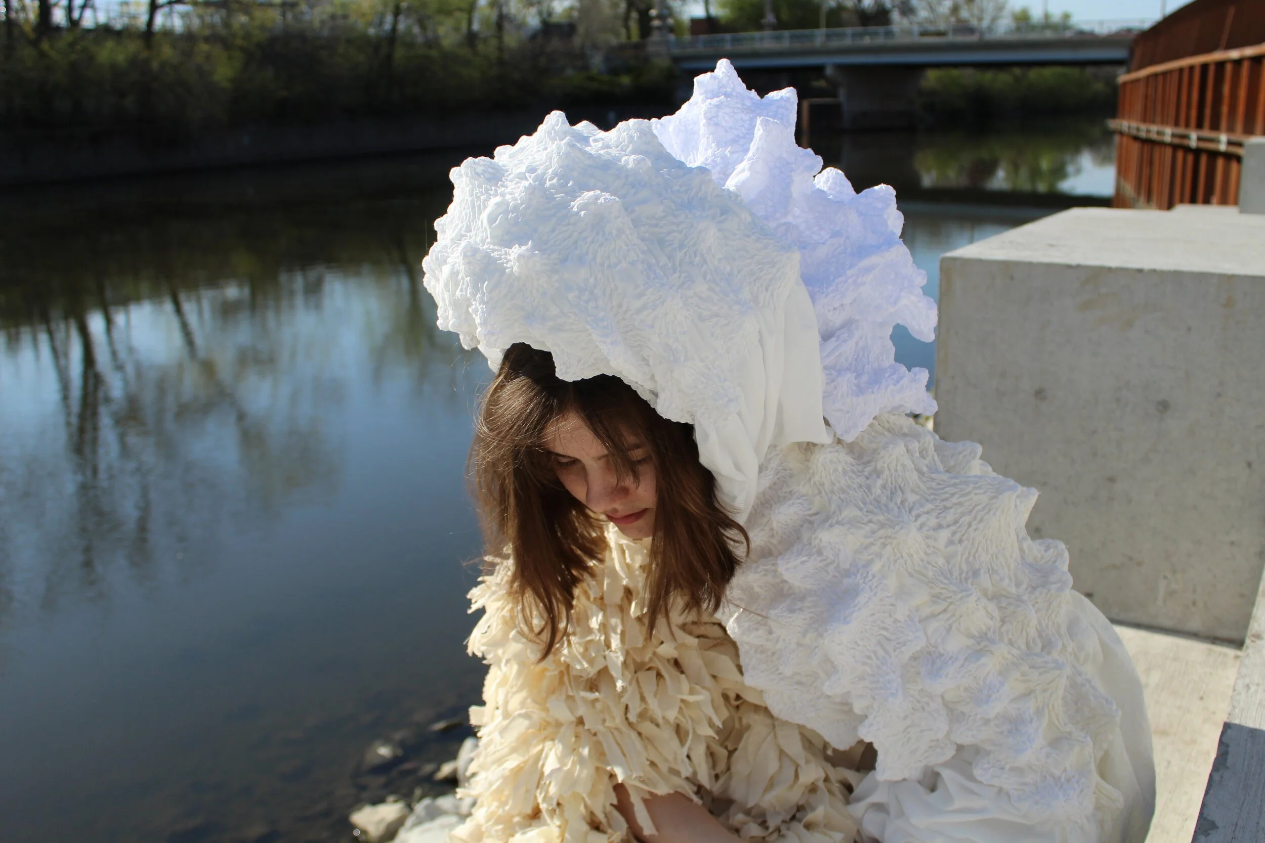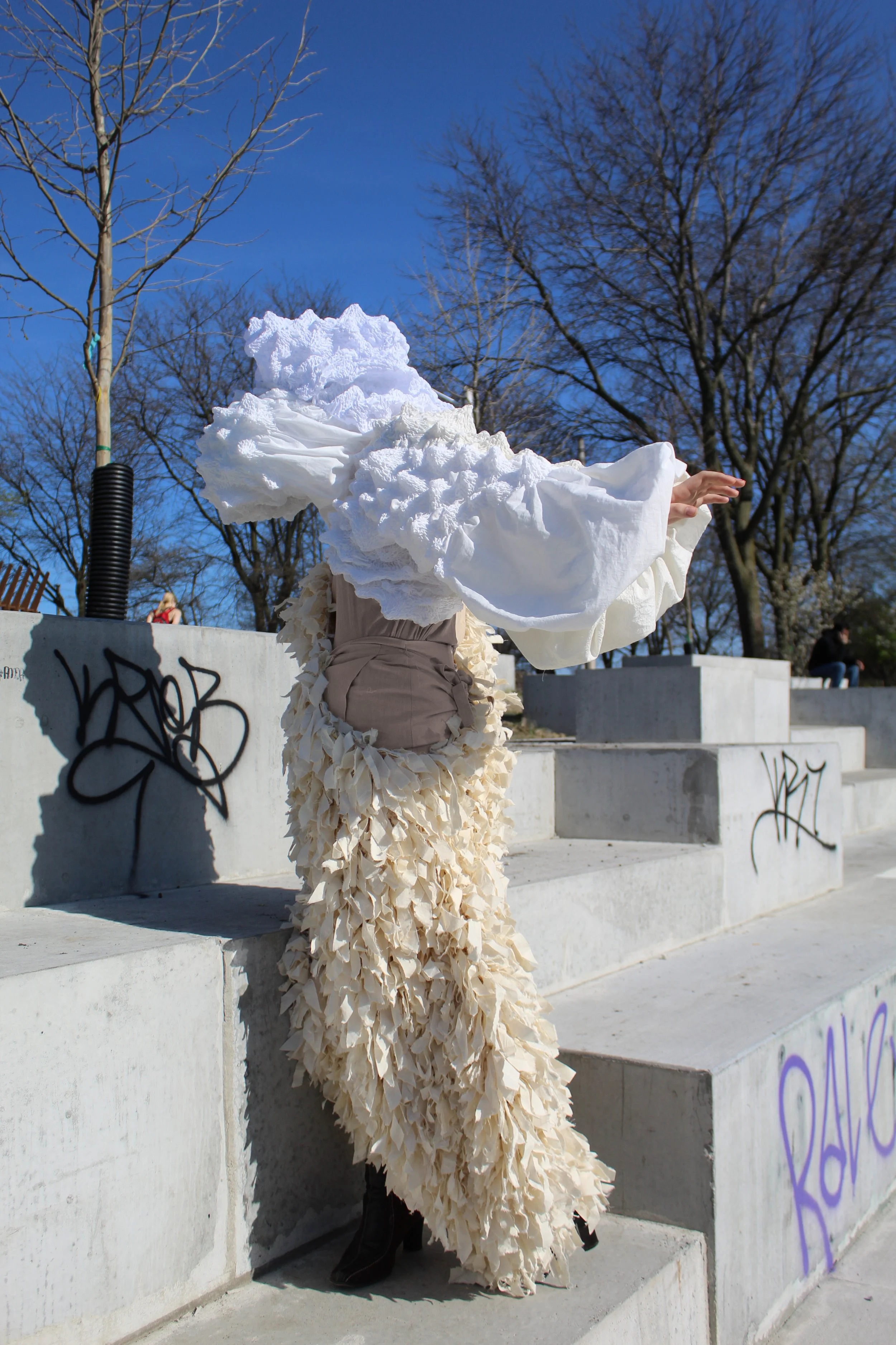 A simpler and more environmentally conscious way of creating means using a smaller variety of materials. The creation of each entire look in this collection uses only non-dyed cotton to fabricate many different textures.